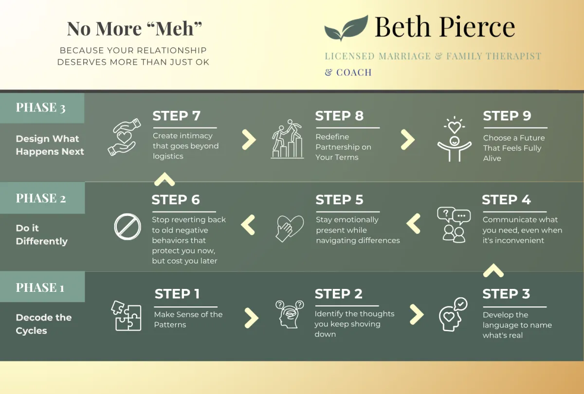 This is the *No More “Meh” Method," a 9-step roadmap that helps you move from functional but disconnected to fully alive and emotionally connected, without losing yourself or pretending things are fine when they’re not.